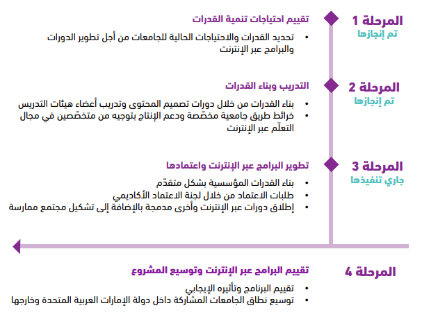 يسعى ائتلاف الجامعات الإماراتي لجودة التعلّم عبر الإنترنت إلى توفير فرص تعليمية شاملة ومبتكرة للشباب الإماراتي والعربي. وباعتباره أول ائتلاف من نوعه في المنطقة العربية، يتبنّى الائتلاف نهجاً متعدد المراحل لبناء قدرات مؤسسات التعليم العالي، وتمكينها من إنتاج برامج معتمدة عبر الإنترنت تلبي احتياجات السوق وتركز على الطلاب.