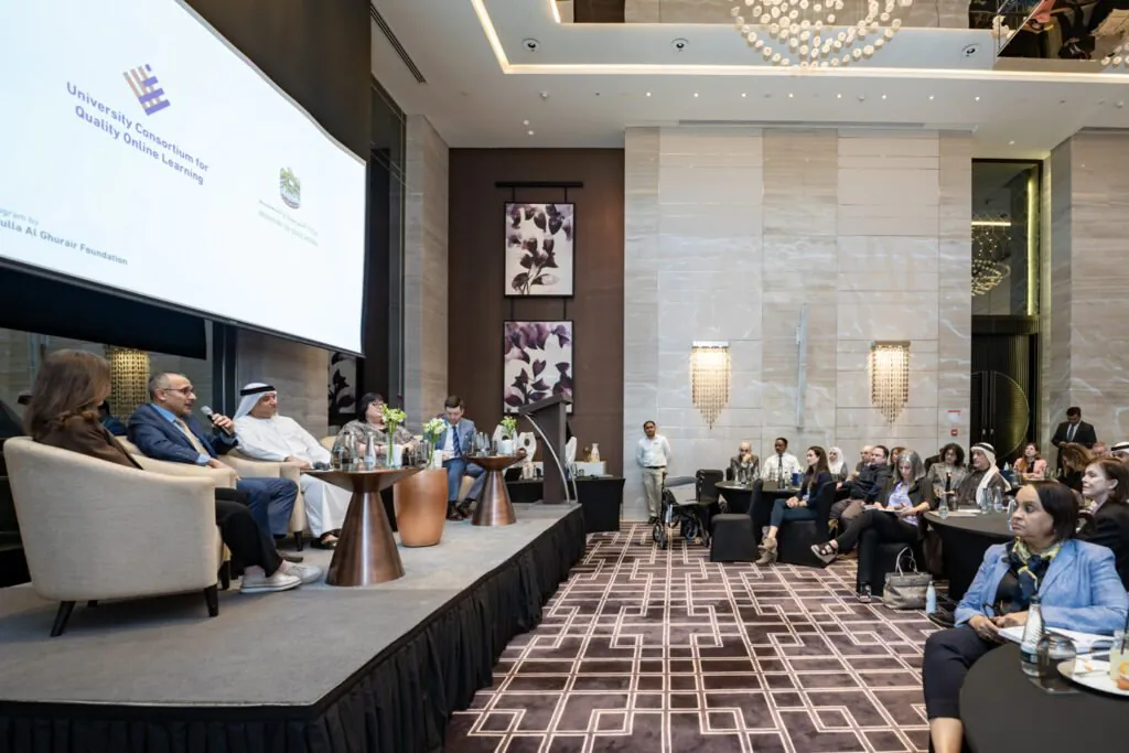 Five speakers on stage at UCQOL conference with banners showing AGF and UAE Ministry of Education logos.